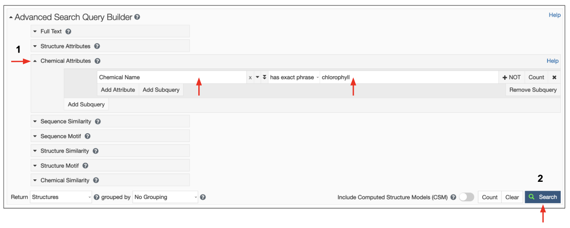 Figure 5: Advanced Search Query Builder options to search for structures with chlorophyll molecules.