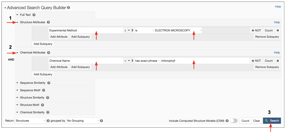 Note: Since one of the query parameters specifies the experimental method as electron microscopy, use the default option and exclude CSMs from the search.
