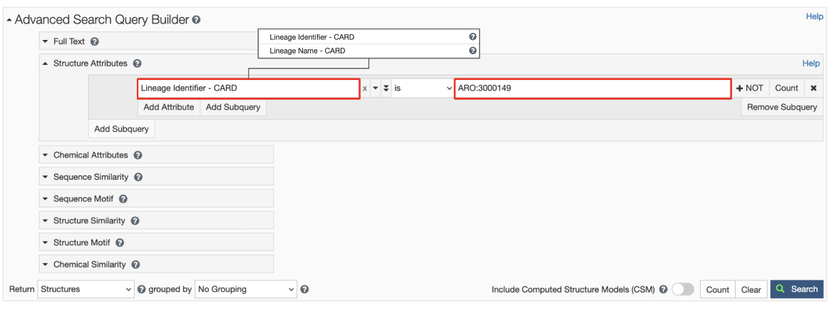 PDB structures of FosA enzyme can be identified using the attribute search option (See Figure 6). In the search attribute options select CARD and specify FosA using the annotation ARO:3000149. Run query.