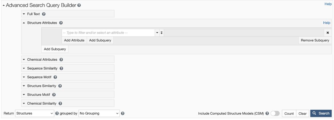 • Structure Attribute option allows searching through annotations that describe biological macromolecules defined in the PDB Exchange Dictionary (PDBx/mmCIF).
