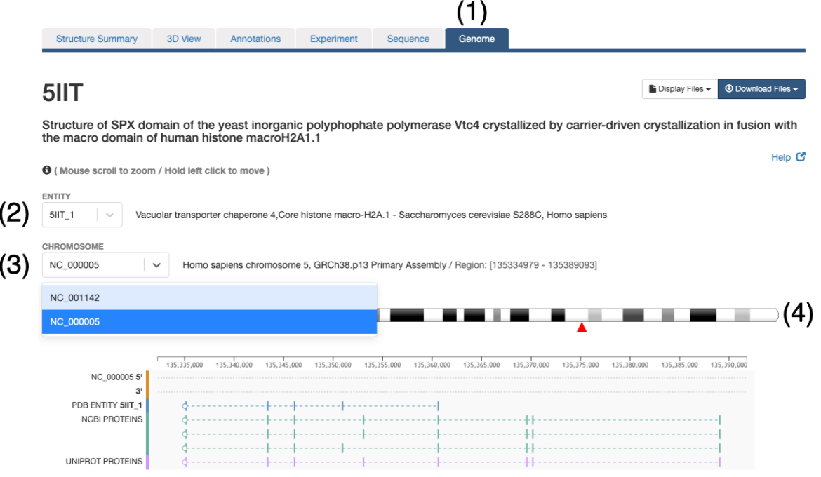 - In order to explore the protein-genome mapping click on the Genome Tab of the Structure Summary Page (e.g. 5IIT)