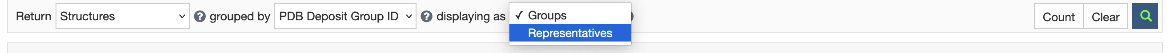 If the Return is set to Structure and results are grouped using the Group Deposition ID option, the results will be organized by groups of structures that were deposited as a collection via RCSB PDB Group Deposition server. The results may be displayed as Groups or Representatives (see Figure 1).