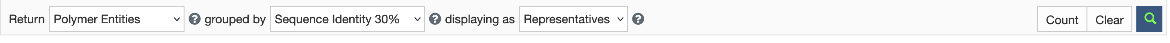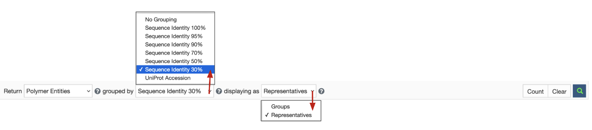 When the Return option is set to Polymer Entities, the search results can be grouped using the UniProt Accession and various Sequence Identity options. Structures in the results that do not match both of the query and grouping criteria are not listed in the grouped results. The results may be displayed as Groups or Representatives (see Figure 2).