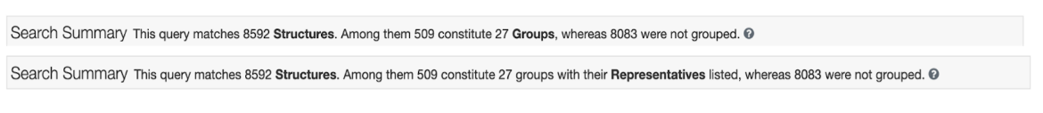 - Representatives - a list of representative members of each group. All other structures in the group are hidden. For the search and grouping criteria used, this is the set of non-redundant matches.