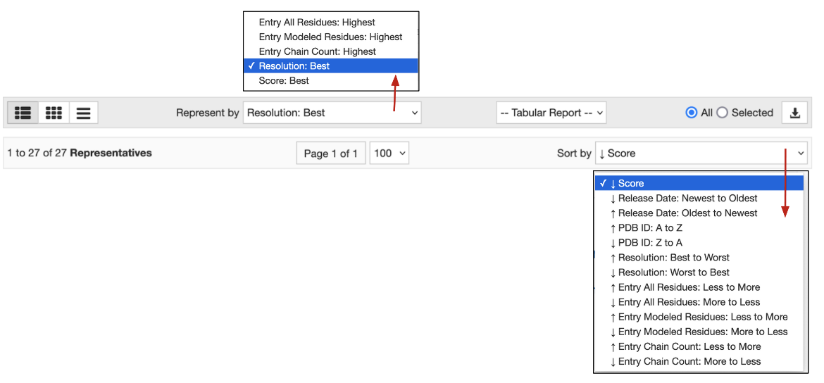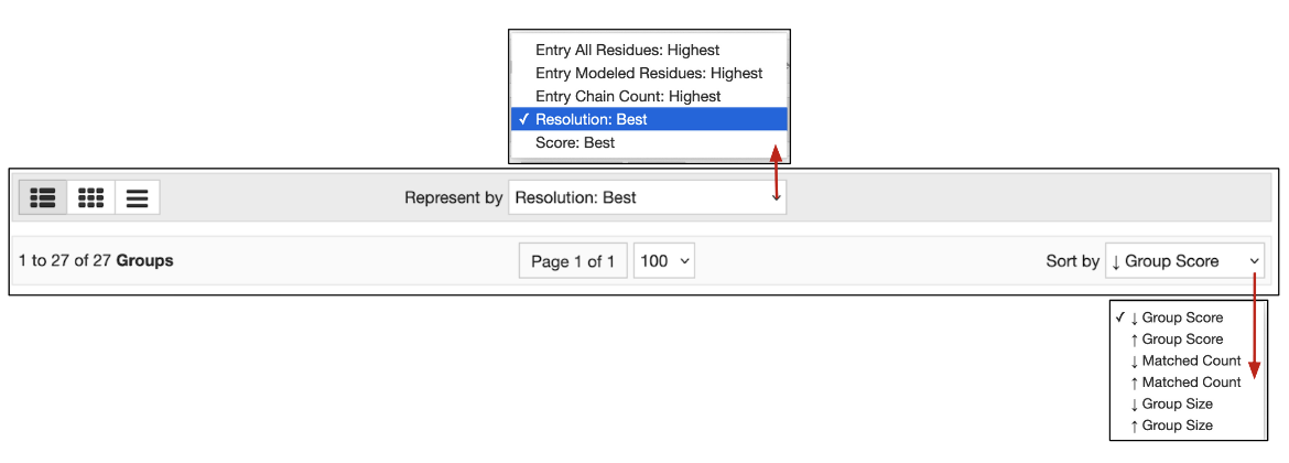 For many proteins, the PDB archive includes multiple structures, providing snapshots of the structure, interactions, and functions of these proteins under different conditions. This redundancy provides opportunities for exploration of biomolecular interactions and functions. In cases when the query results include many matches to the same or similar proteins, it may be helpful to be able to remove redundancy by grouping and organizing the search results in meaningful ways.