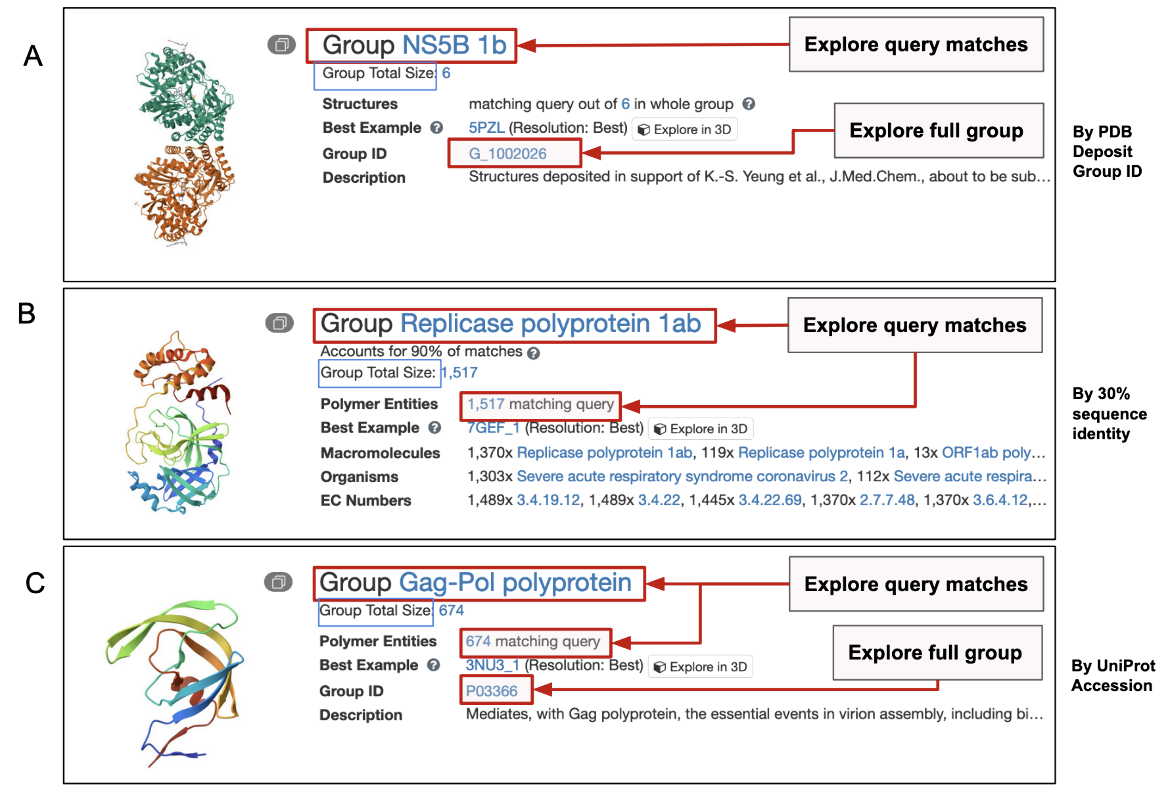- Group ID is shown if the grouping criteria use either the PDB deposit Group ID (Panel A) or UniProt Accession (panel C). No group ID is shown for groups formed by sequence clusters because this identifier is subject to change over time.