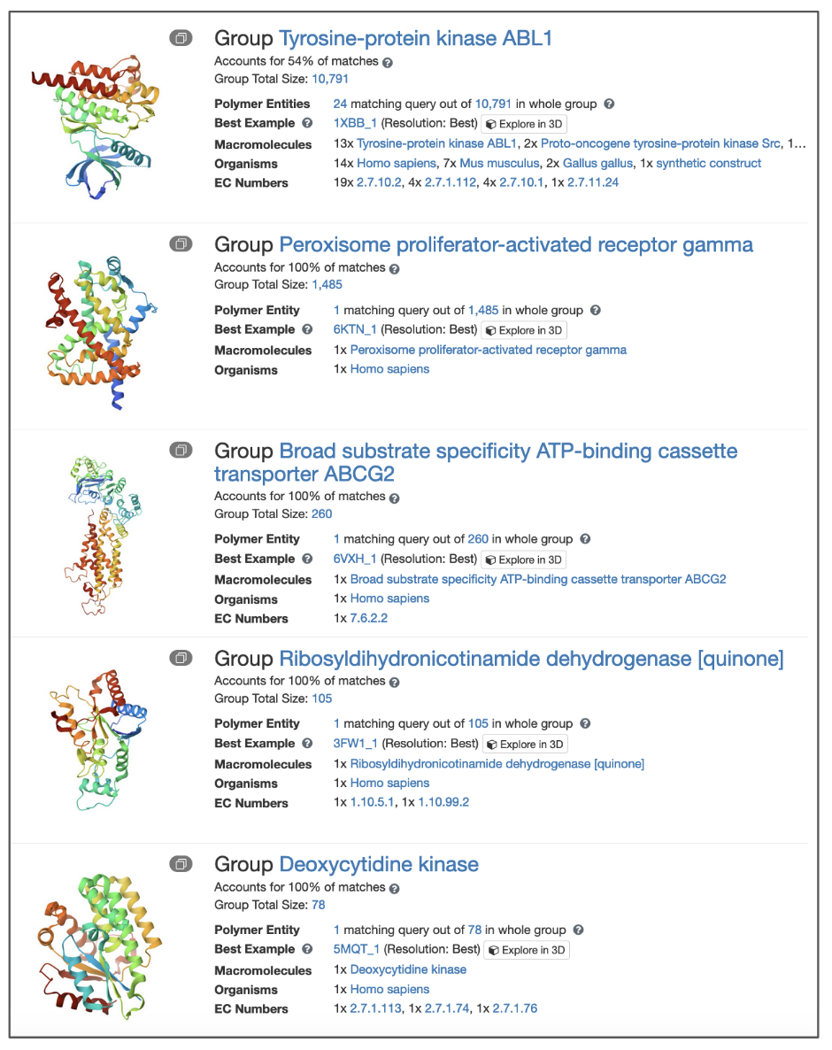 The choice of grouping options depends on the selected Return option, e.g., Structures, Polymer Entities. Different grouping options produce groups that can be used to explore different types of information. Once the query with selected grouping is run, the search results are organized into distinct groups and descriptive summaries of the groups are presented to the user. Search matches assigned to the same group are similar to one another based on the grouping criteria, e.g., sharing the level of sequence identity, while search results assigned to different groups should be different from one another.