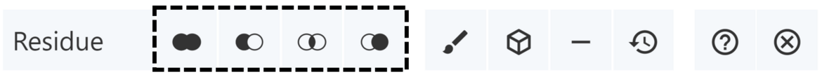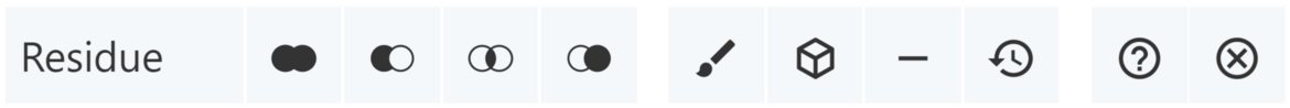 Selection Mode allows parts of 3D structures to be selected by clicking on them. It also allows residues to be selected through Set Operations Menus. Selection Mode is enabled by clicking on the cursor icon in the Toggle Menu. Activating Selection Mode opens a toolbar that appears at the top of the 3D canvas. The following provides an illustration of the toolbar and a description of each of the buttons: