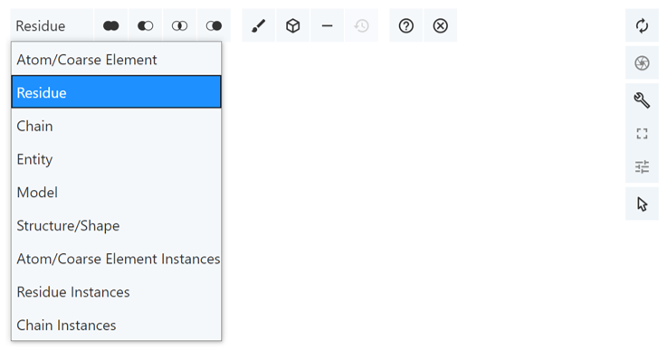 The Picking Level in Mol* controls to what level a selection or highlight interaction is applied. Specifically, a selection/interaction can be extended from a single atom to a residue, chain, entity, model, or structure. The default level is residue. For the case of structures with symmetry instances, the interaction can also be extended to include all atom, residue, and chain instances of the clicked atom. In addition, the Picking Level determines the specificity of a selection in the Sequence Panel, or the specificity of the focus in Default Mode. The Picking Level menu can be changed via a menu in the Selection Mode toolbar located at the top of the 3D canvas.