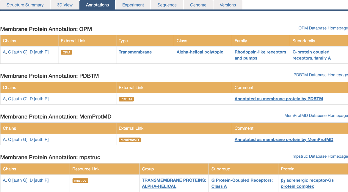 Figure 3: Detailed information is available on the Annotations page. External links point to OPM, PDBTM, MemProtMD, or mpstruc. A detailed classification is available for OPM and mpstruc. Bold links launch a search for proteins with the same annotation
