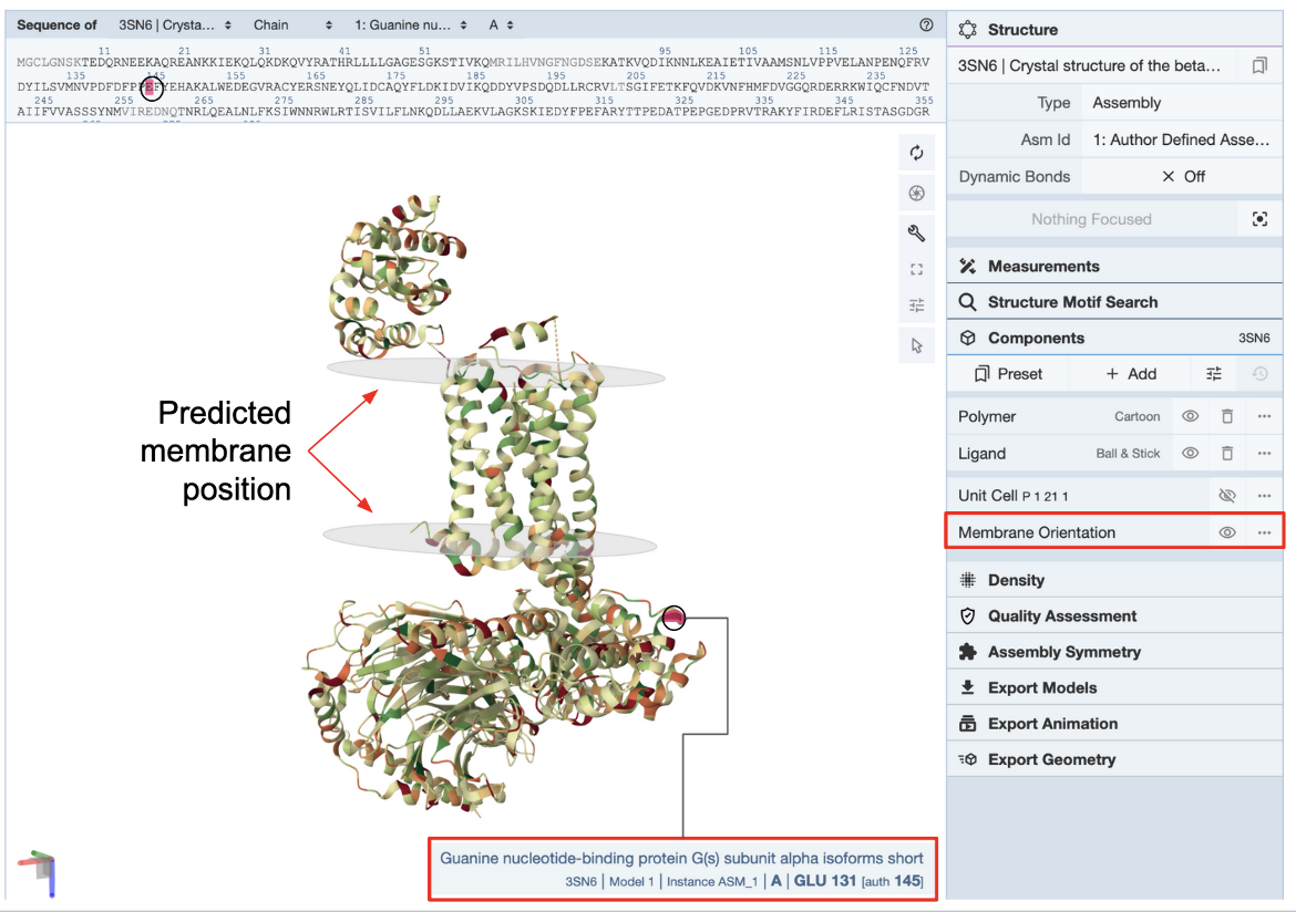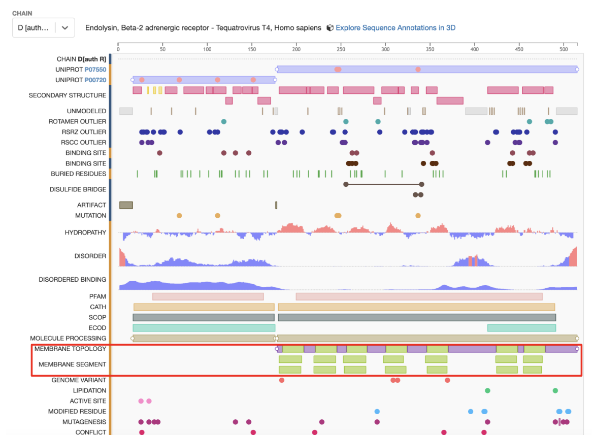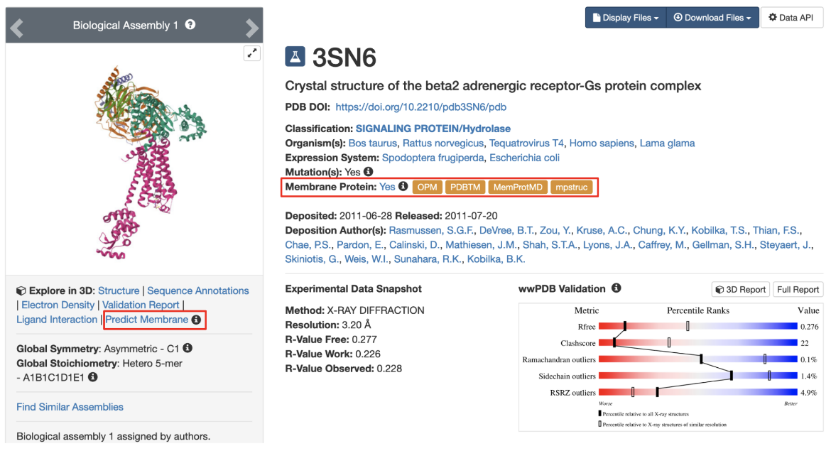 The PDB entry 3sn6 features the human chimeric β2-adrenergic receptor in complex with G-proteins and a nanobody. The receptor itself is a chimeric molecule (meaning there is a bacterial protein fused to the human protein at the N-terminus to increase solubility and stability). However, the focus of the study (and discussion here) is the human receptor protein, which has transmembrane helices (see Figure 1). A variety of information related to membrane associations can be accessed: