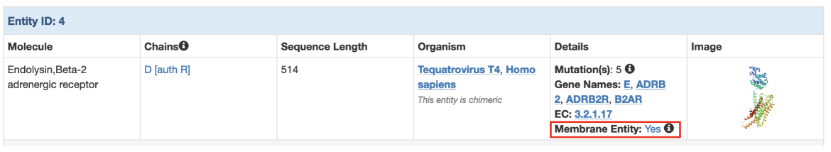 On the Structure Summary page the receptor protein is Entity 4 and shows a dedicated 'Membrane Entity' property (Figure 2). This indicates that this entity is annotated as transmembrane or membrane-associated by OPM, PDBTM, MemProtMD, or mpstruc.
