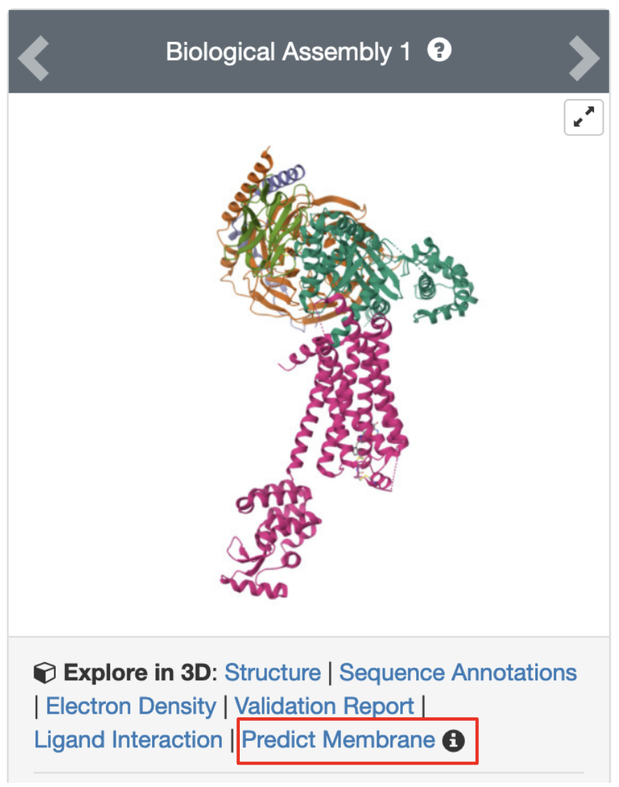 Any entry annotated as a Membrane Protein includes a link to a special Mol* viewer that predicts and visualizes membrane location and orientation. The membrane location prediction can be visualized by clicking on the Predict Membrane option below the thumbnail image of the structure (Figure 5). Please note that the link will be specific to the displayed assembly. Use the arrows at the top to switch to another assembly (if applicable) or to the asymmetric unit.