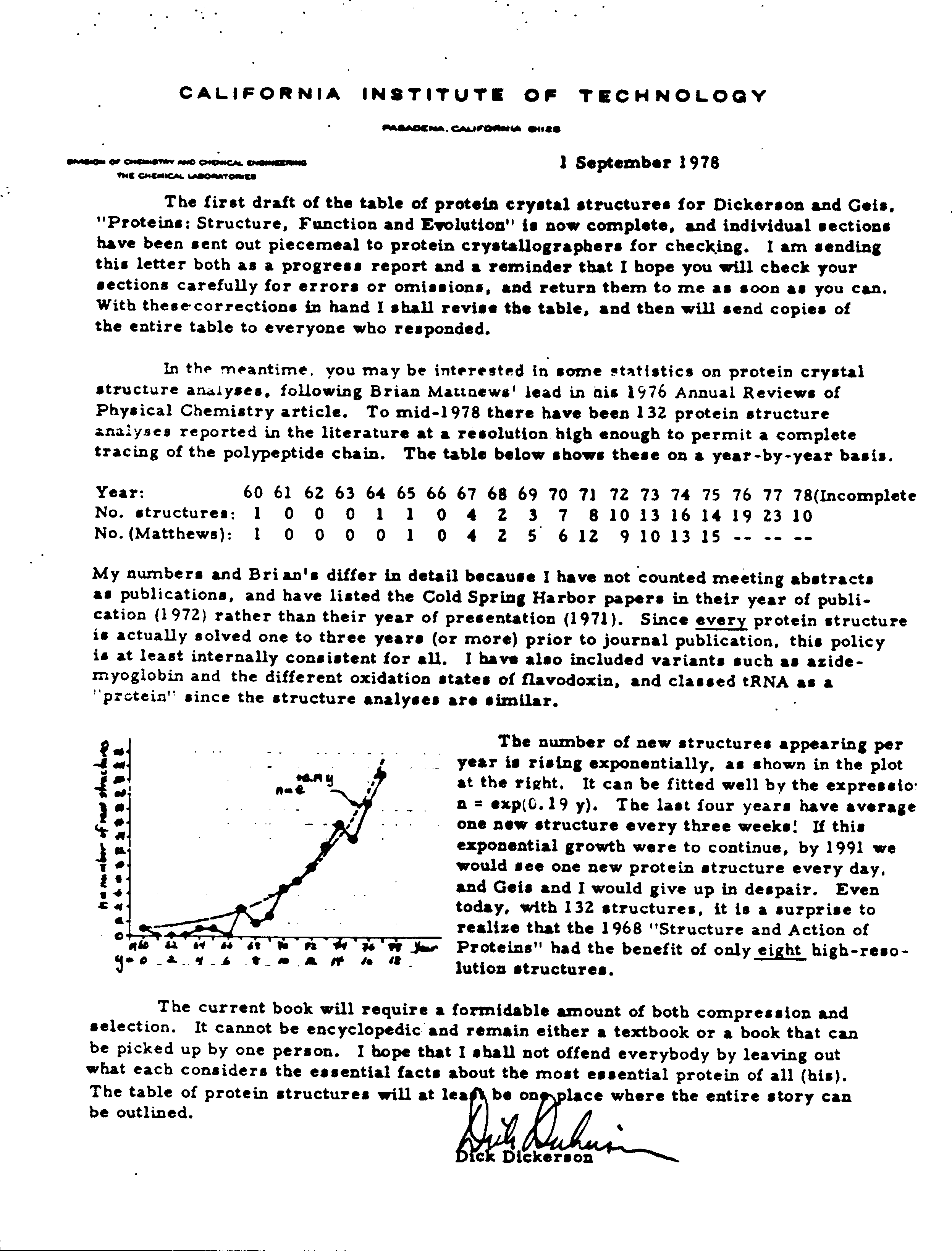 In a letter describing a book he was working on with Irving Geis, Dickerson noted (and illustrated with a hand-drawn graph) that the number of new structures appeared to be following the exponential law n = exp(0.19 y), where n is the number of new structures per year and y is the year number since 1960. This equation predicted that at the end of 2001, there would be 13,941 crystal structure entries available in the PDB (14,000 crystal structures are currently available). Using this equation, there should be 24667 crystal structures in 2004.