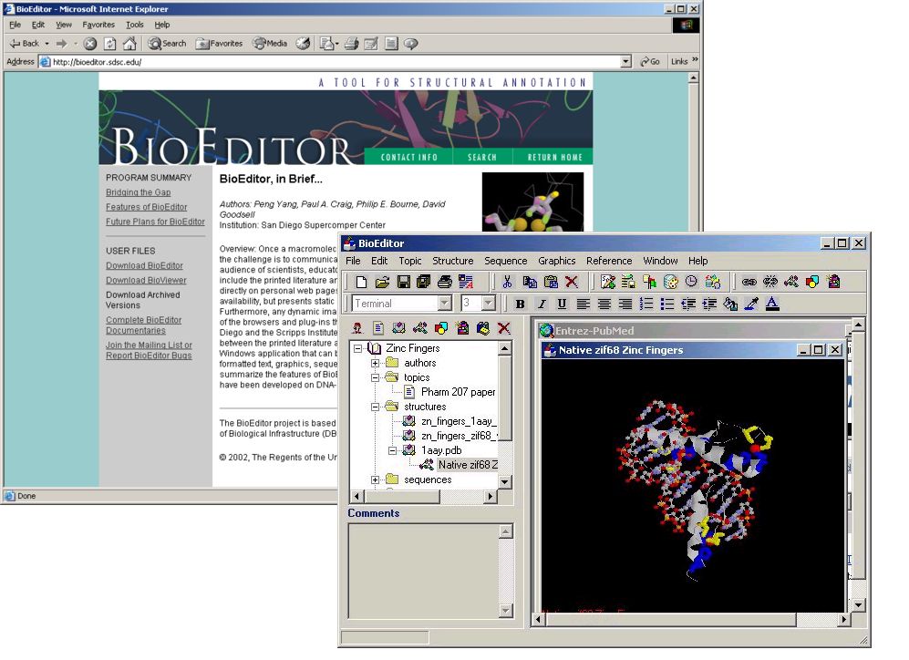 BioEditor is designed to be used by structural scientists reporting and evaluating their data, as well as by educators and students who are seeking to relate structure to function in biological macromolecules. The BioEditor application includes features that enable the user to enter data, images, and references. Many features also link directly to resources on the internet.