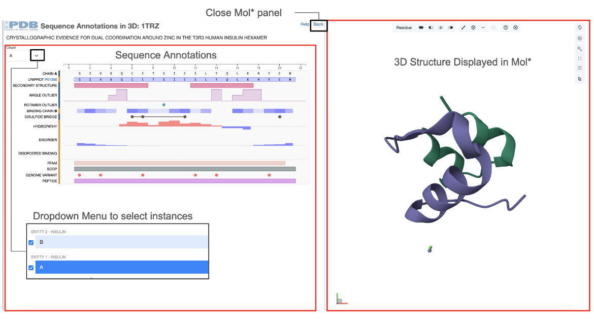 This feature is available from the Sequence Tab of the Structure Summary page of any 3D structure entry by clicking on the Explore Sequence Annotations in 3D link (e.g 1trz). Two dynamically connected panels display the integrated data - the Mol* plugin displays the structural information of protein assemblies and the RCSB PDB PFV shows the positional features of proteins (see Figure 1).