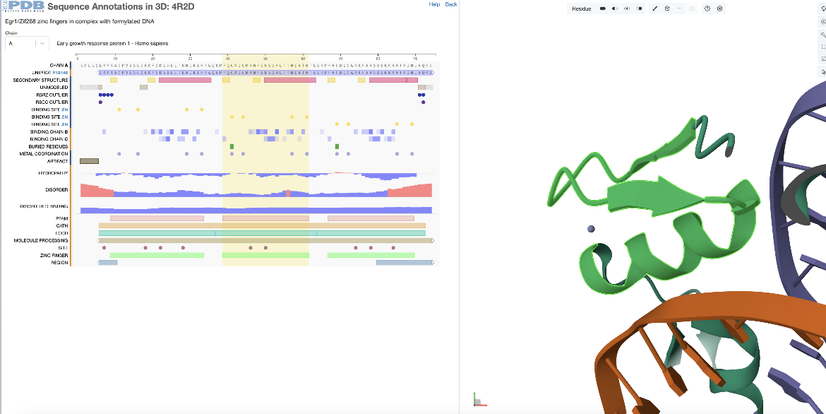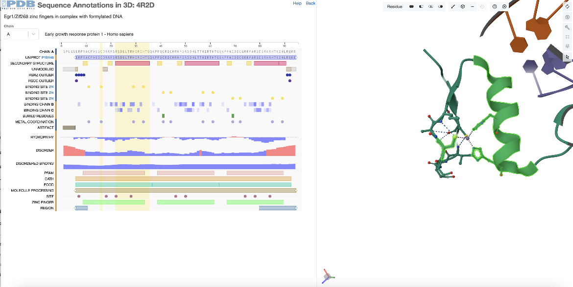 | Figure 2: Focusing on the second zinc finger domain (a positional feature) in PDB ID 4r2d, selected from the sequence panel |