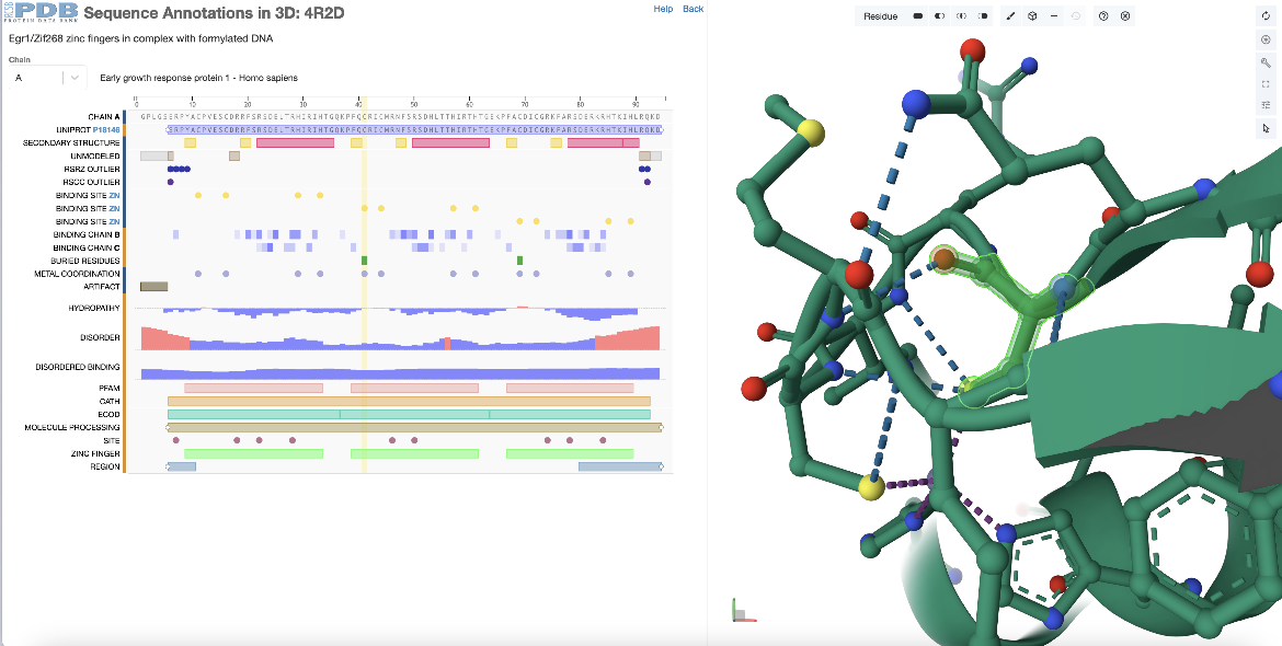 In the sequence panel examine the annotations and click on a residue marked as a zinc binding site in the second zinc finger domain (chain A, residue 41 or residue 370 by author numbering). The residue is highlighted with yellow rectangle in the sequence panel and the corresponding residue is highlighted in green in the 3D structure. In addition to focusing in on this residue in the Mol* panel it displays the non-covalent interactions within 5Å of the selected residue with dashed lines between interacting atoms (Figure 3).