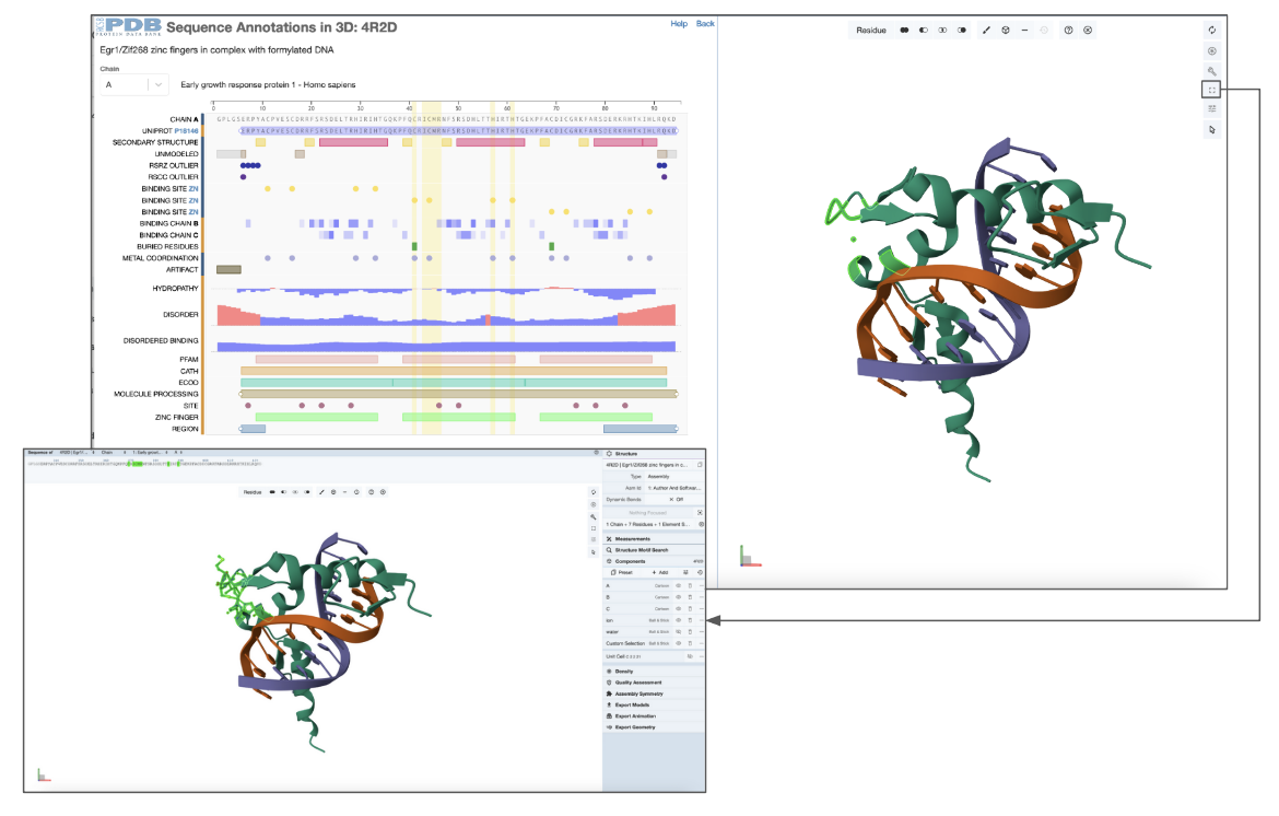 The Sequence Annotations in 3D feature maps protein sequence features (i.e., positions of interest in a protein sequence) onto the 3D structure of protein assemblies for visualization and analysis. This resource integrates structural information from the RCSB PDB and protein positional features (such as sites of mutation, catalytic residues, and secondary structural regions) from external resources including UniProt, CATH and SCOPe. The integrated information is displayed in two dynamically connected panels: the Mol* plugin displays the 3D structures of protein assemblies and the RCSB PDB PFV shows the protein sequence positional features.
