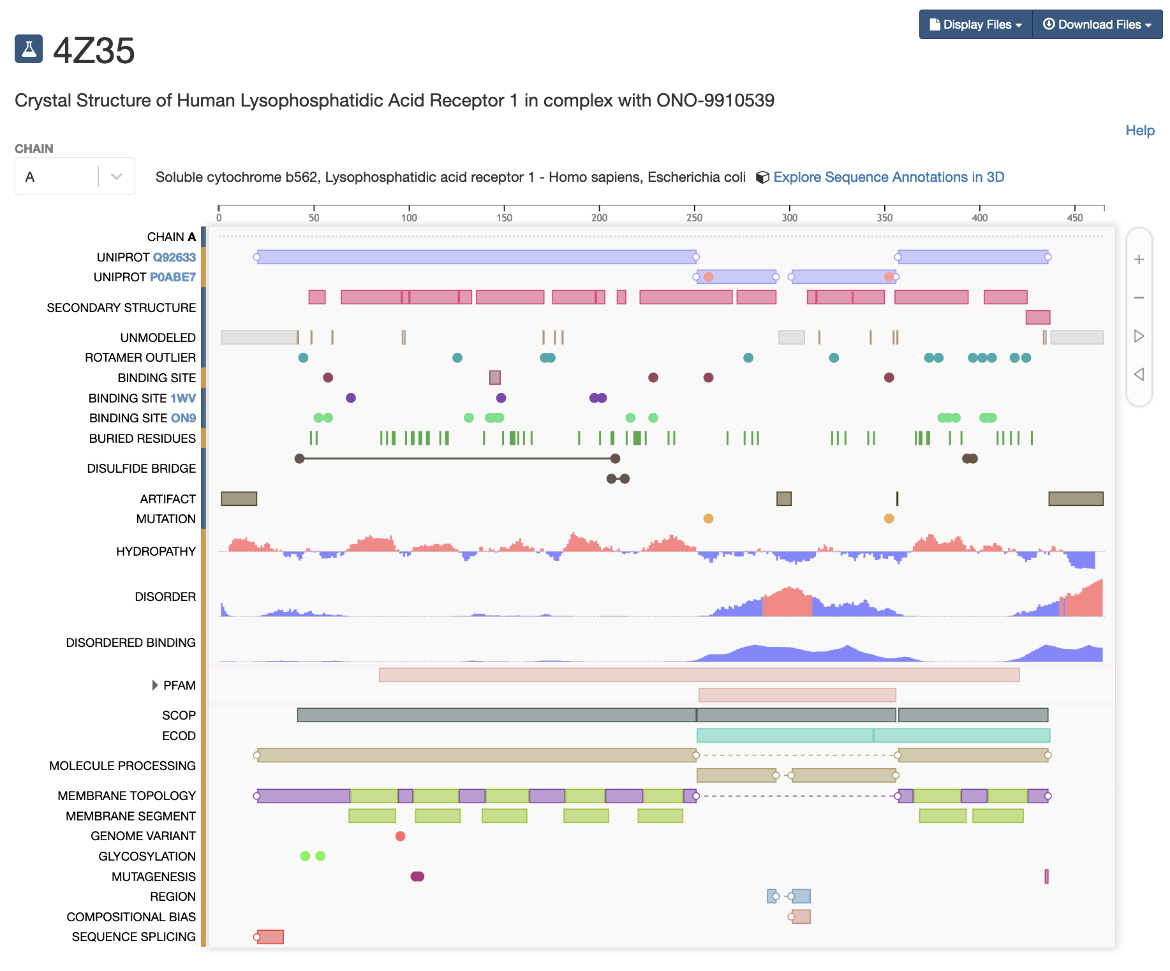 In the Sequence Tab (e.g. 4z35) the Sequence Annotations Viewer will display the full range of available features (structural and biological annotations) and the alignments between Polymer Instances (chains) and UniProtKB sequences. The select menu can be used to display the features for the different PDB Polymer Instances (chains) of the current Entry (Figure 1).