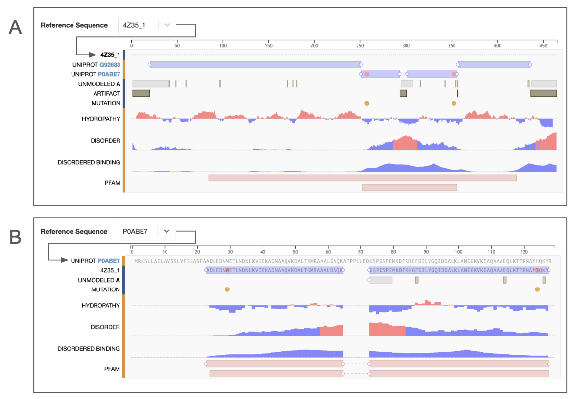The Sequence Annotations Viewer in the Structure Summary Pages (e.g. 4z35) displays the alignments between PDB Entity sequences and UniProtKB. Additionally, it includes Entity features such as mutations and artifacts, and the different regions that has not been (or partially) observed at Instance level. The select menu can be used to change the reference (Entity/UniProtKB) over which features are mapped and displayed (Figure 2).