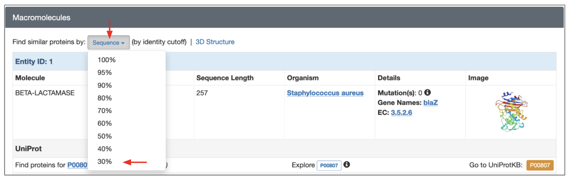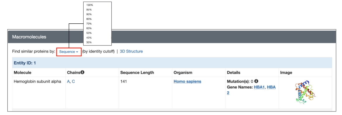 Each structure in the PDB has a dedicated Structure Summary page that displays information about the entities in that entry. To search for polymer entities with sequences similar to that of a specific polymer entity click on the “Sequence” link above the details listed for the macromolecular entity and choose the desired sequence identity level from the drop-down (Figure 3). The search is run with the default E-value cutoff (0.1). This and other search options are explained further in the following section.