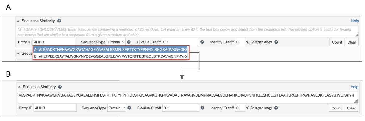 Figure 2: Options for sequence similarity search from the Advanced Search Query Builder - A. input structure ID and select polymer chain of interest; B. the selected polymer chain sequence is populated in the Sequence similarity search box.