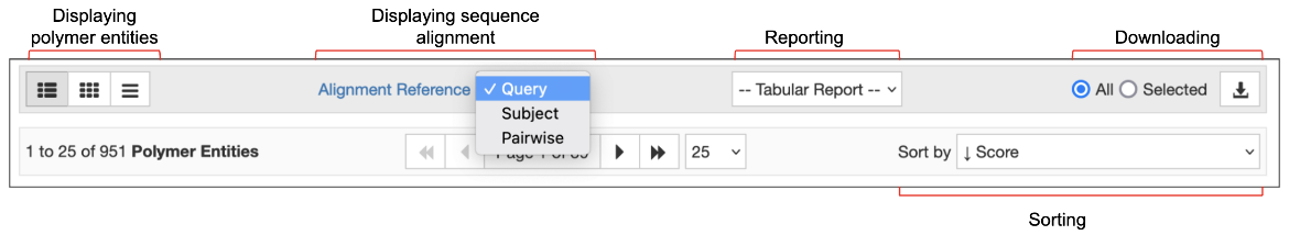 At the top of the search results page, several options are available for displaying, reporting, sorting, and downloading all or selected entities, entries, and assemblies that match the query.