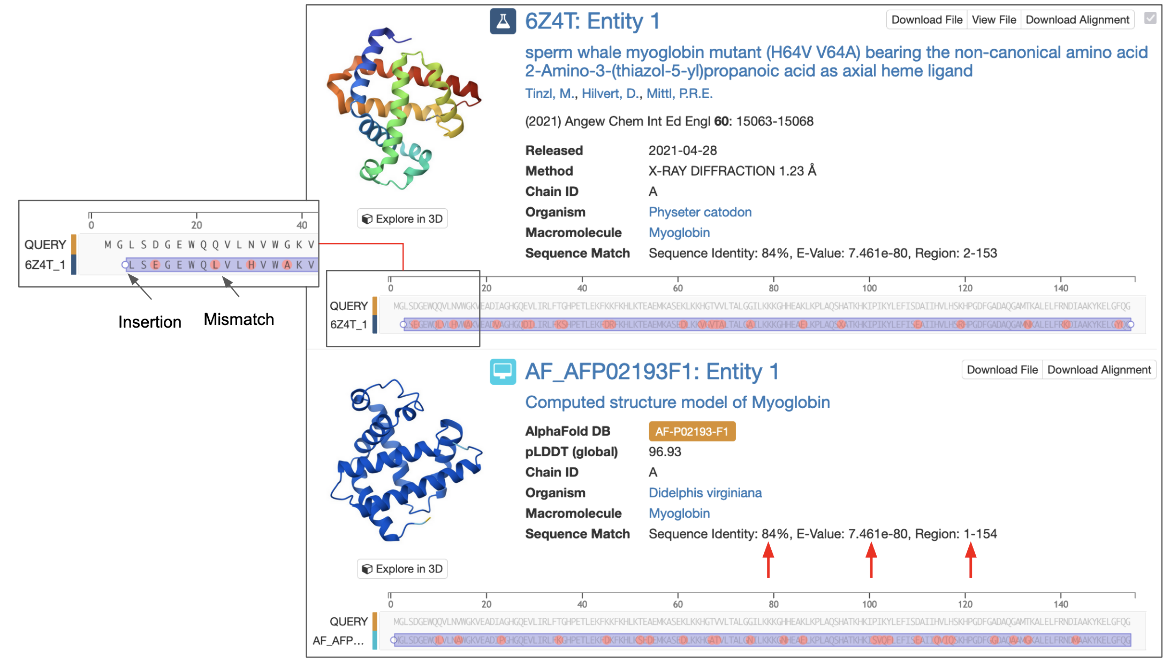 Figure 6: Part of a sequence similarity search results page showing an experimental structure and a CSM that matched the query. The inset shows a zoomed in view of the sequence alignment including an insertion and several mismatches. Sequence similarity measures are highlighted with red arrows.