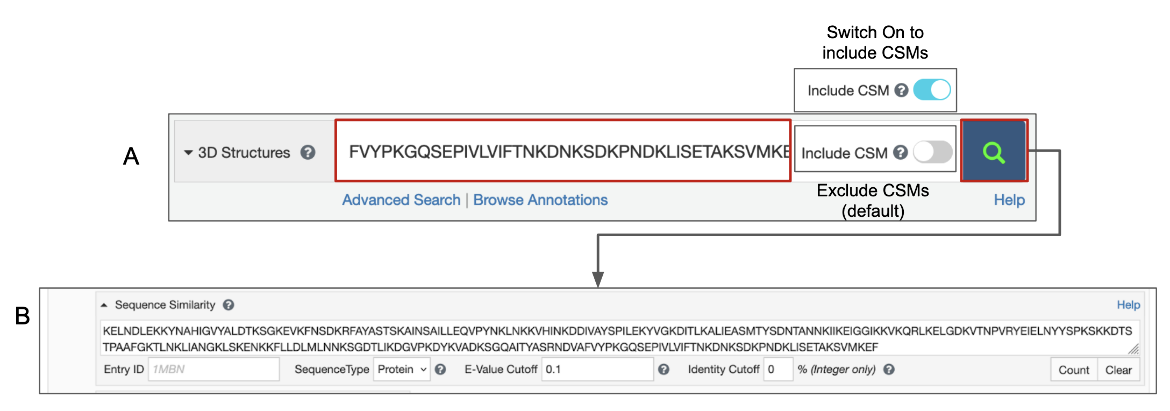 Figure 1: Options for sequence similarity search from the Top bar search box - A. paste FASTA sequence; B. the query sequence is transfered to the Sequence Similarity search options in the Advanced Search Query Builder to run the search. Note: Turn on the toggle switch to Include CSMs.