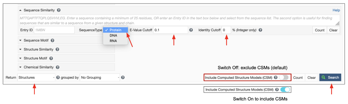 • Search Target: There are three possible target databases for the sequence similarity search present in the PDB and in CSMs available from RCSB.org - (1) all current protein sequences, (2) all current DNA sequences and (3) all current RNA sequences.