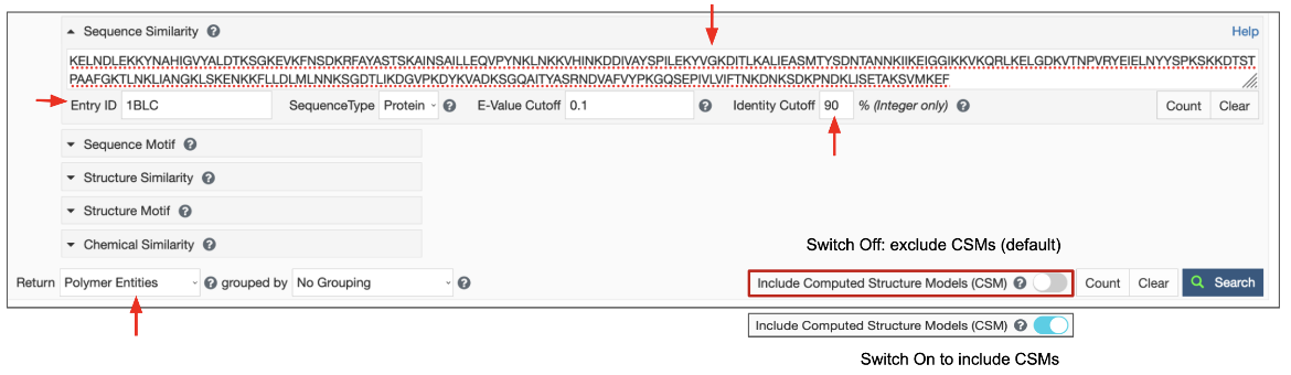 Figure 7: Setting up the sequence similarity search for the sequence in Chain A of PDB entry 1blc, at 90% sequence identity. Turn on the toggle switch to include CSMs.