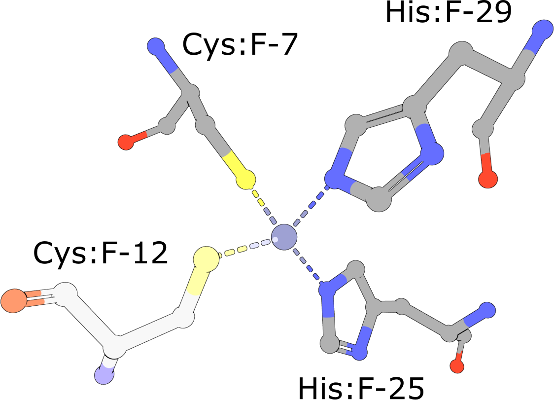 Eukaryotic transcription factors often contain His2/Cys2 Zinc Finger domains (PDB ID 1g2f) that bind DNA. These motifs are composed of two cysteine and two histidine residues, which stabilize a small ββα domain structure that envelopes and coordinates a single zinc ion (Pabo, 2001). In the absence of the zinc ion, these domains do not adopt compact, folded structures and are incapable of binding DNA.