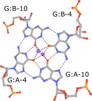 G-tetrads are a common nucleic acid association motif (PDB ID 3mij). They are composed of guanines and stabilized by Hoogsteen base pairings. The four O6 oxygen atoms coordinate monovalent ions, such as K+, and individual tetrads tend to be stacked one atop the other (Burge, 2006).