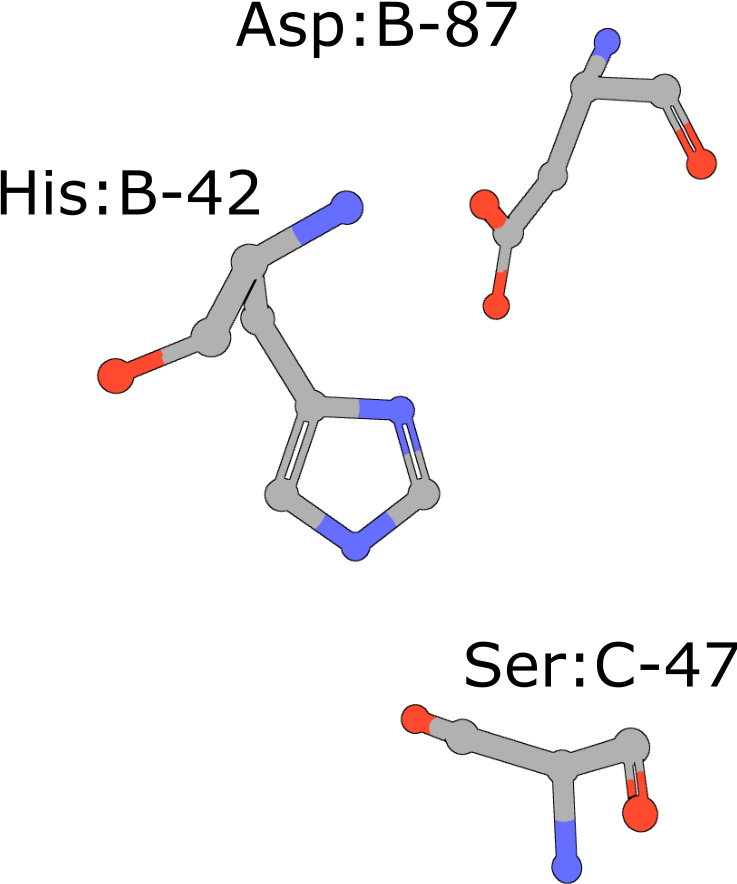 Many hydrolases use a serine nucleophile during catalysis. Canonical serine protease catalytic triads are composed of His, Asp, and Ser residues (PDB ID 4cha). Typically these residues occur within two polypeptide chains, because many of these proteases are initially made as zymogens that require activation by proteolytic processing (Hedstrom, 2002) to prevent uncontrolled digestion of proteins within the cell.