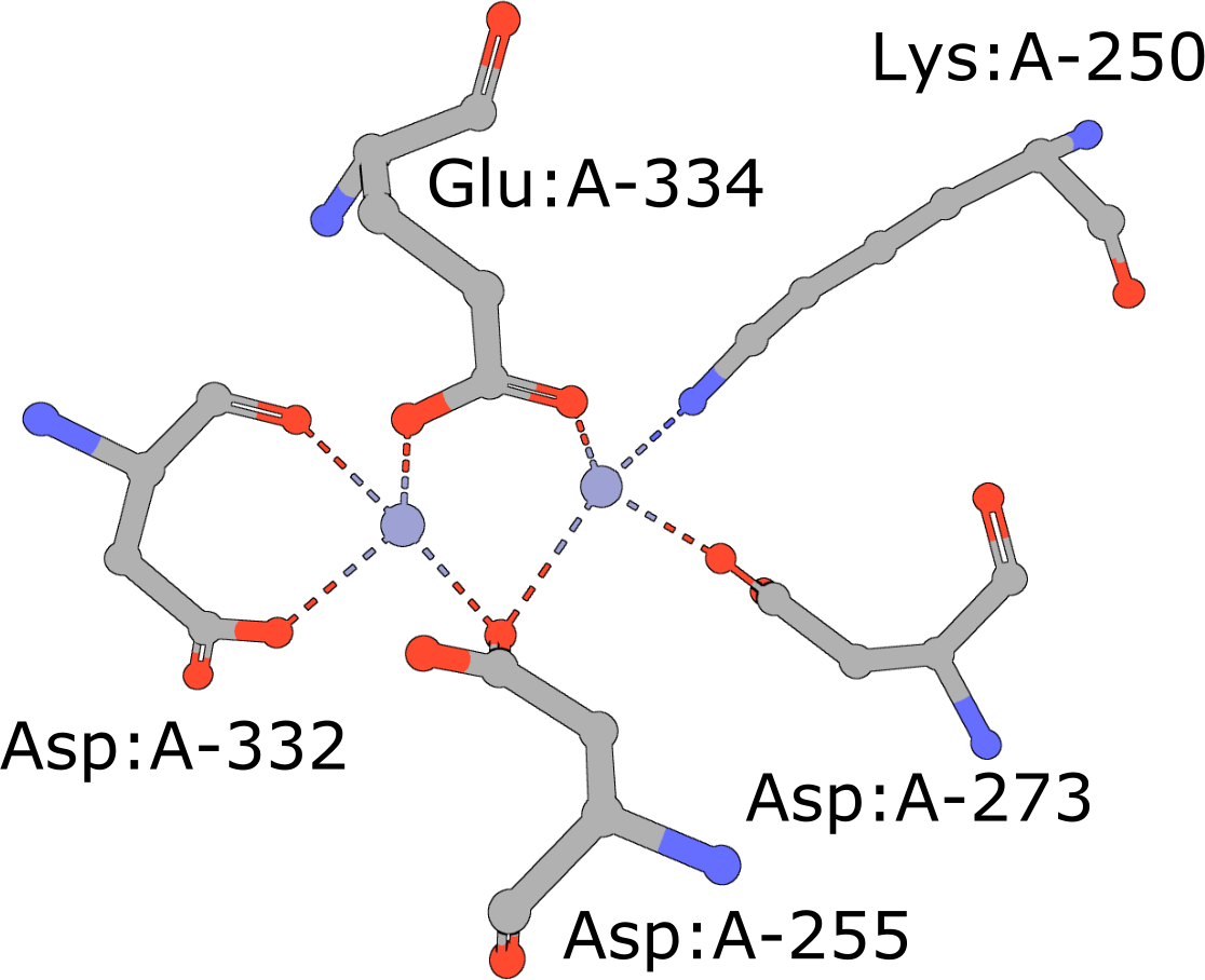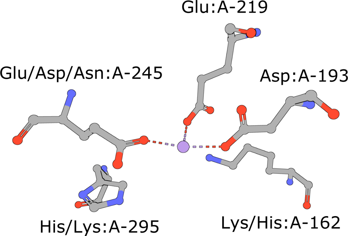 Figure 1: Five residues representing the enolase superfamily are shown here. Note multiple amino acids are seen at three of these positions. The amino acids are identified by their amino acid name 3 letter abbreviation, chain ID (label_asym_id) and residue number (label_seq_id).