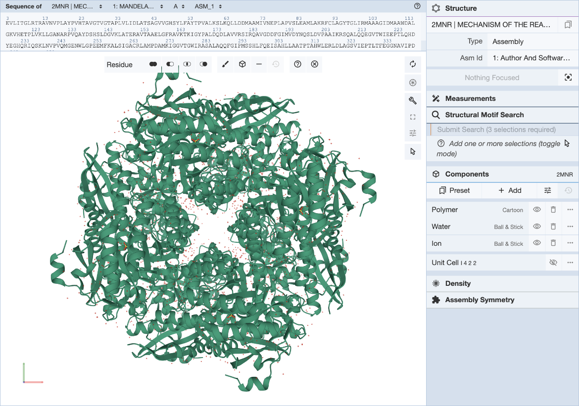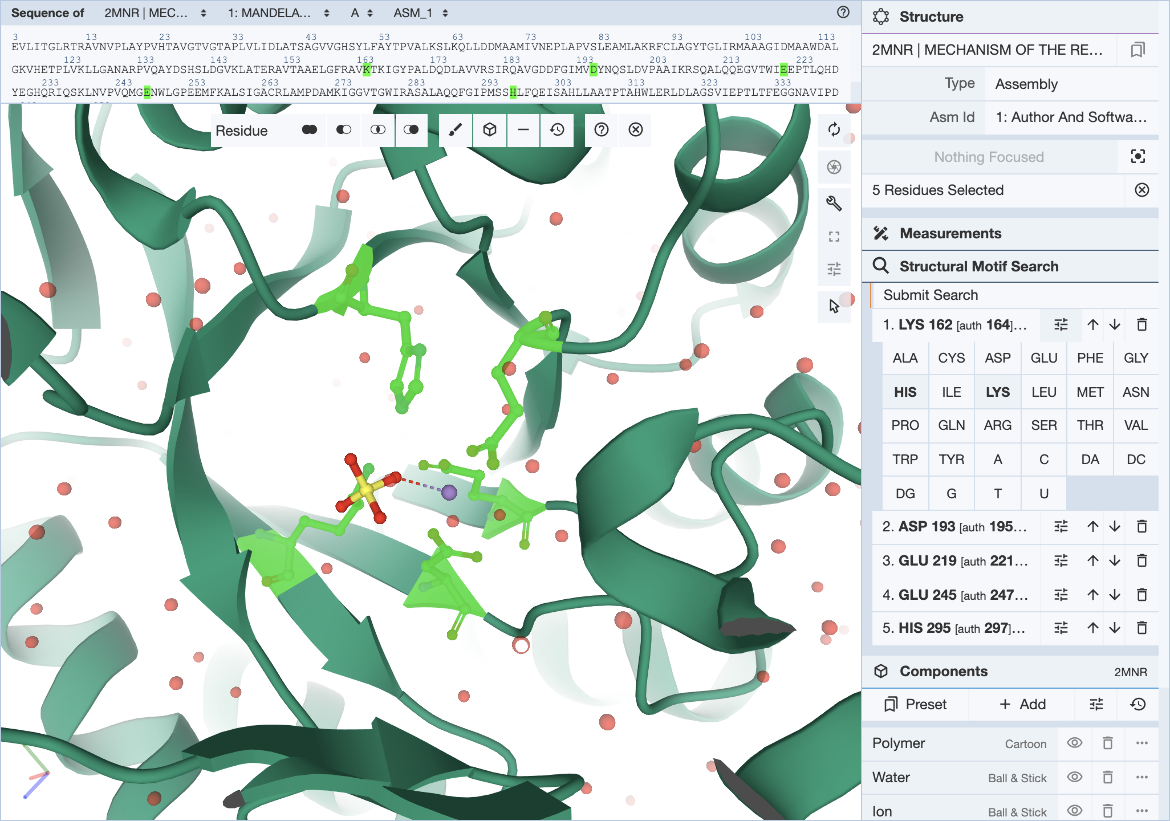 Select individual residues by clicking on them either in the 3D canvas or in the sequence panel. The selected residues will be populated in the Structure Motif Search list in the control panel. Up to 10 residues may be included in this list. Add to the selection by clicking on additional residues, or remove residues by clicking on the trash icon in the residue list. The ‘Structure Motif Search’ element of Mol* behaves like the ‘Measurements’ panel.