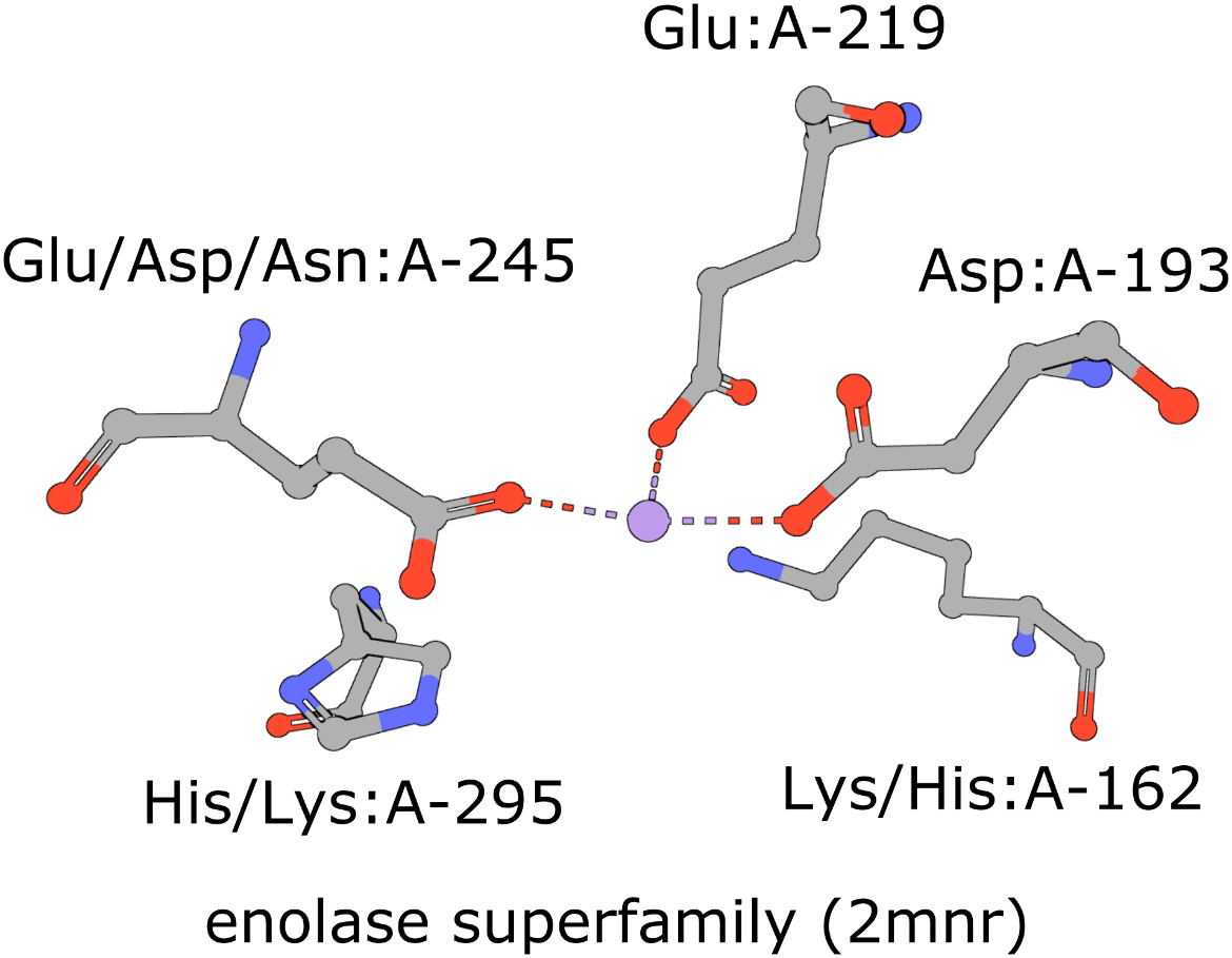 The active site of the enolase superfamily is used as an example here (Figure 1, Meng et al., 2004). The enolase superfamily is a group of proteins diverse in sequence, yet largely similar in 3D structure that all catalyze removal of a proton from a carboxylic acid (Babbitt et al., 1996).