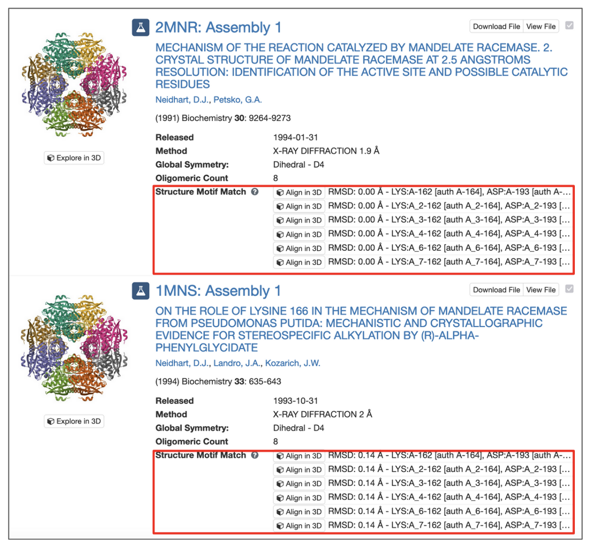 All assemblies in the PDB archive that contain groups of residues that resemble the query motif are returned and sets of residues that match the query are identified by their label_asym_id and label_seq_id. Discrepancies between label_seq_id and auth_seq_id will be reported in square brackets. The label_comp_id of each residue is reported. The RMSD score of the match is provided as well (see Figure 8).