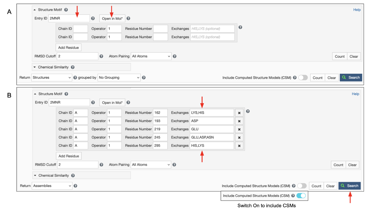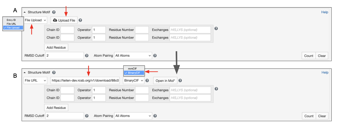 Figure 5: Advanced Search panel showing the Structure Motif search panel. A. After typing in an Entry ID the "Open in Mol*" button appears (marked with red arrows). B. Structure motif search panel autofilled by Mol* and extended manually.