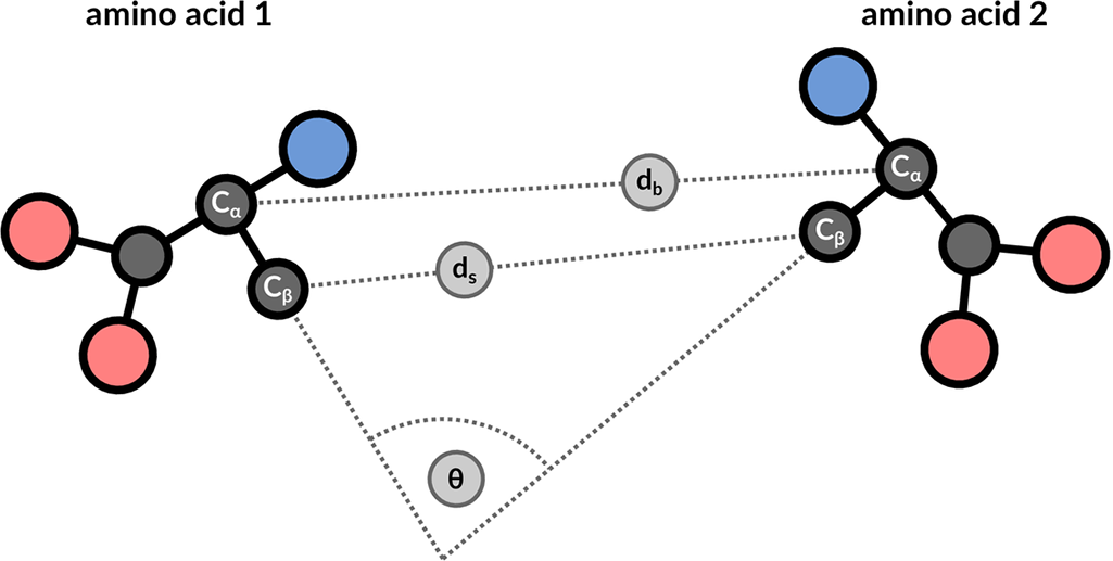 Figure 9: 3 geometric properties are used to describe residue pairs: backbone distance between Cα atoms, side-chain distance between Cβ atoms, and angle between the corresponding vectors.