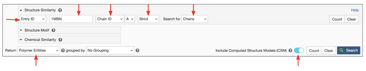 Figure 10: Options to run a structure based search for chain ID A in PDB entry 1mbn, to return polymer entities. The search includes CSMs.