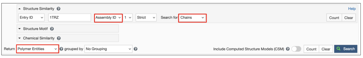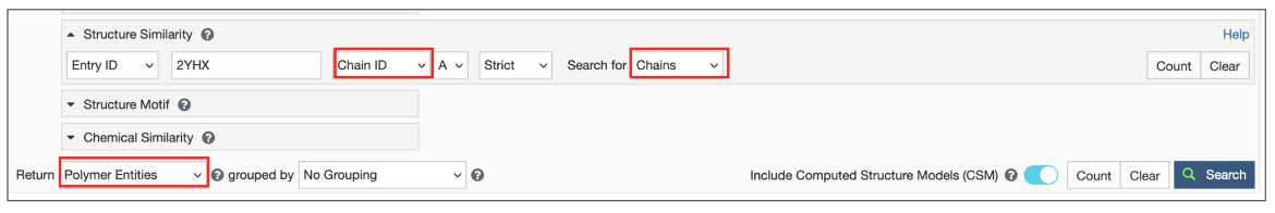 • Select the strict search option, Display results as Polymer Entities, include CSMs, and launch the search.