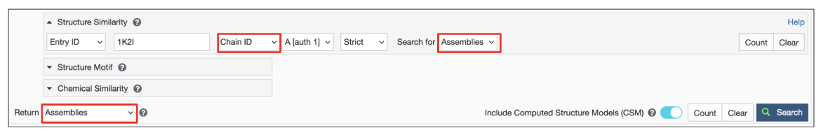 The search will be based on the deposited coordinates, also referred to as “asymmetric unit”. Note: this is different from the 3D experimental or CSM entry-ID-based query, which allows you to select a specific assembly or chain identifier for the search.
