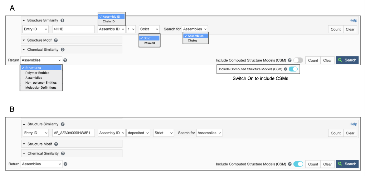 Figure 2: Options to specify a Structure Similarity Search - A. using a PDB ID and assembly ID and deciding whether to include or exclude CSMs; B. using an RCSB.org assigned CSM ID, turn on Include CSM toggle switch. In both cases specify the results Return type to be Assemblies, before launching the search.