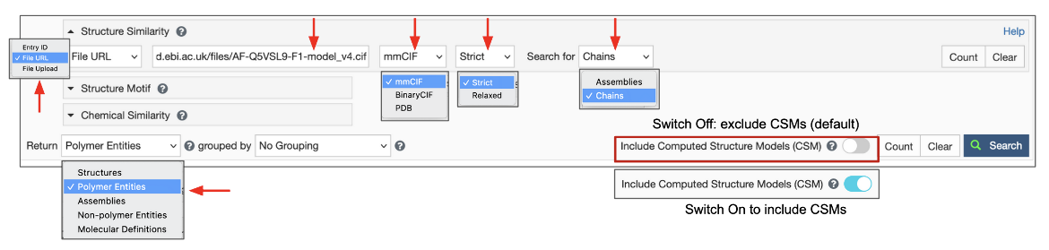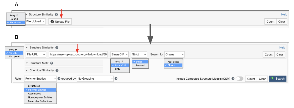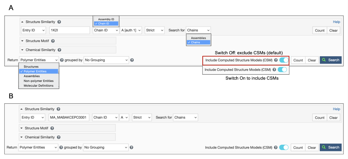 Figure 3: Options to specify a Structure Similarity Search - A. using a PDB ID and chain ID and deciding whether to include or exclude CSMs; B. using an RCSB.org assigned CSM ID, turn on Include CSM toggle switch. In both cases specify the results Return type to be Polymer Entities, before launching the search.