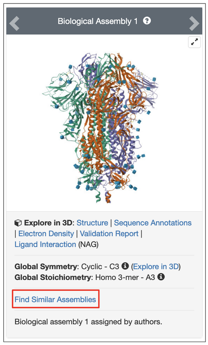 • To find spike structures where all three receptor-binding domains are closed, launch the structure similarity search from the Structure Summary page for the PDB ID 6vxx, Biological Assembly 1 (Figure 12).