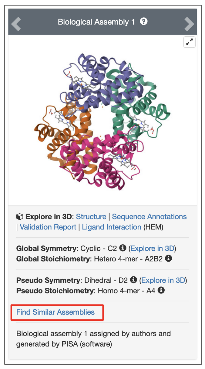 Moreover, some proteins are stabilized and/or function as part of an assembly - where it interacts with one or more copies of itself or with other proteins. The structure similarity search option allows you to identify similar assemblies - enabling exploration of shape and interactions of the protein (or its complex).