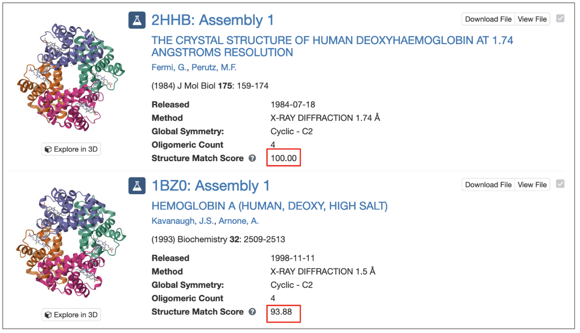 For assembly based searches, each matched assembly is assigned a structure match score, expressed as a percentage of the probability that it matches the query structure. So a score of 100 indicates a perfect match while lower numbers indicate lesser degrees of similarity in the assemblies (Figure 9).