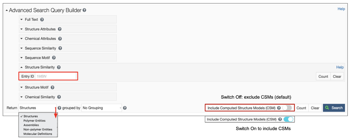 If an RCSB.org assigned CSM ID is used for this search, remember to turn on the Include CSM toggle switch (see Figures 3B).